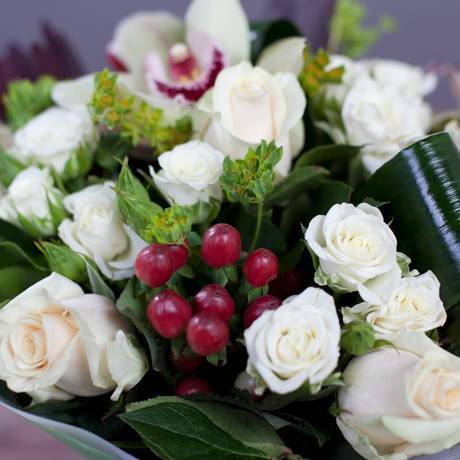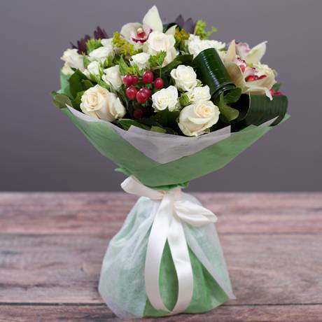 Роза - 9 шт, Гиперикум - 5 шт, Альстримерия - 5 шт, Орхидея цимбидиум - 9 шт