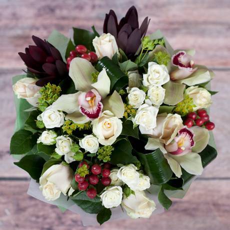 Роза - 7 шт, Фрезия - 4 шт, Орхидея цимбидиум - 3 шт, Салал - 5 шт, Гипсофила - 3 шт