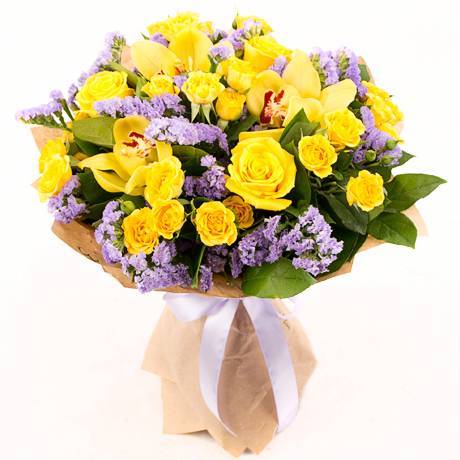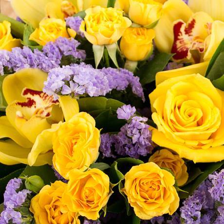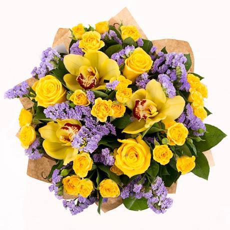 Роза - 9 шт, Орхидея цимбидиум - 9 шт, Статица - 7 шт, Ирис - 13 шт