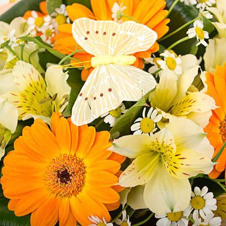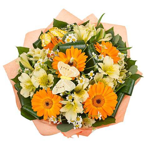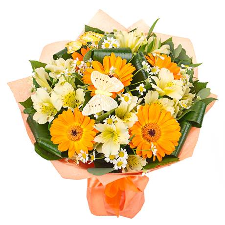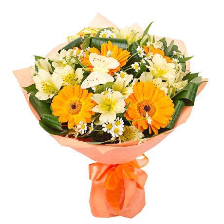 Гербера - 3 шт, Гербера - 4 шт, Альстримерия - 10 шт, Ирис - 11 шт, Салал - 3 шт, Амбрелла - 3 шт