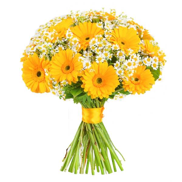 Еще никогда огненная гербера не выглядела так красиво и нарядно! Флористы отдали ей основную роль в букете «Любви начало было летом», создав для крупных акцентных бутонов отличный фон из миниатюрных цветов танацетума. Очень оригинально смотрится широкая лента в тон герберам, которой перевязан букет. Такой подарок в одно мгновение поразит в самое сердце и завоюет симпатию!