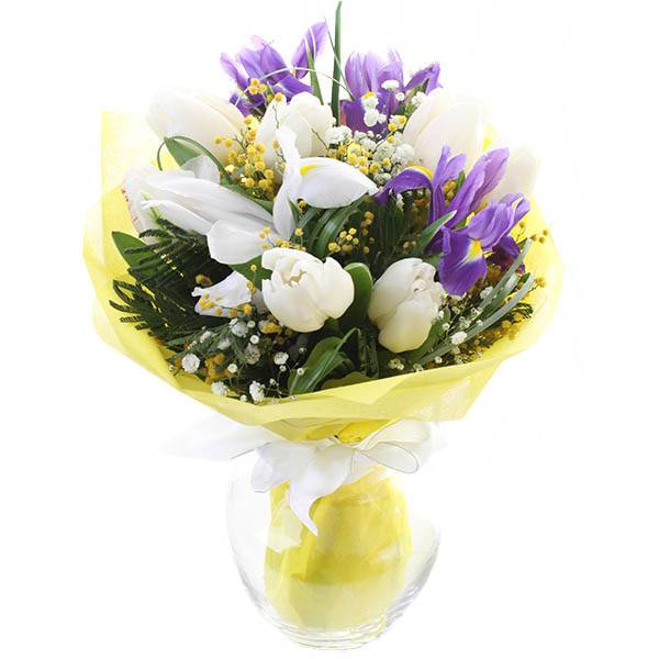 Воздушный и нежный букет «Первое возвращение» - это очарование весны, олицетворение тепла и торжественности. Именно поэтому с таким подарком можно прийти по любому поводу и без него. В его основе белые тюльпаны, лиловые ирисы, веточки утонченной гипсофилы и мимозы. В качестве зеленого обрамления выбраны листья берграса, фисташки и салала. Упаковочная бумага насыщенного желтого цвета делает букет еще более красивым и оригинальным.