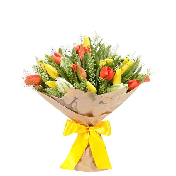 Трогательная и нежная композиция из разноцветных тюльпанов. Это букет, ассоциирующийся с весенним настроением, пробуждением природы и зарождением новых чувств. Для возлюбленной самый удачный вариант.